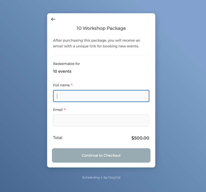 For workshops or events that you plan to offer multiple times, CozyCal's package booking feature provides an elegant solution. You can create package bundles that allow attendees to purchase multiple workshop spots at once. There's no separate guest portal or account creation required. Guests can redeem their purchased sessions easily through their receipt.