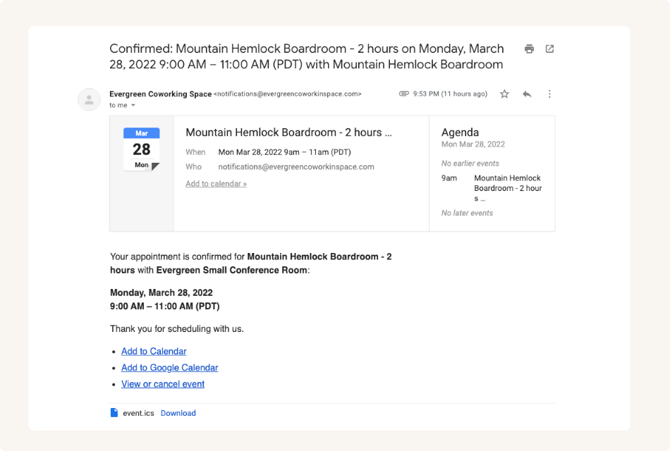 To better integrate business branding in the resource booking process, CozyCal supports sending white-label emails directly from your business's email address. Booked clients can email you directly for questions which minimize friction in communication.