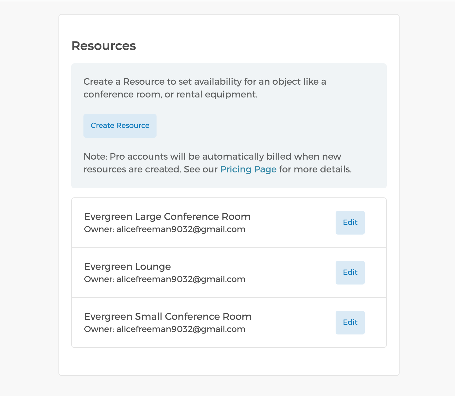 On the booking page, you can list resources or create event types associated with the resources. With Stripe integration, pricing can be listed for resources and payments are charged when bookings are confirmed.