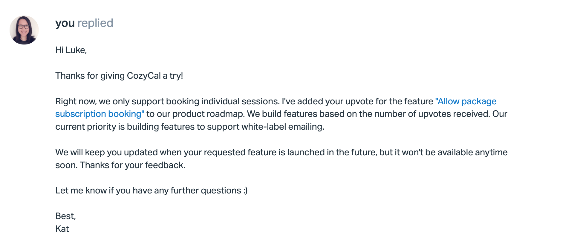 Based on collected feedback we can learn the gaps that need to be filled by CozyCal. For example, we saw an increasing number of upvotes for the feature "allow package subscription scheduling". This trend signals that there is an unmet need with subscription scheduling for businesses that are offering packaged services.